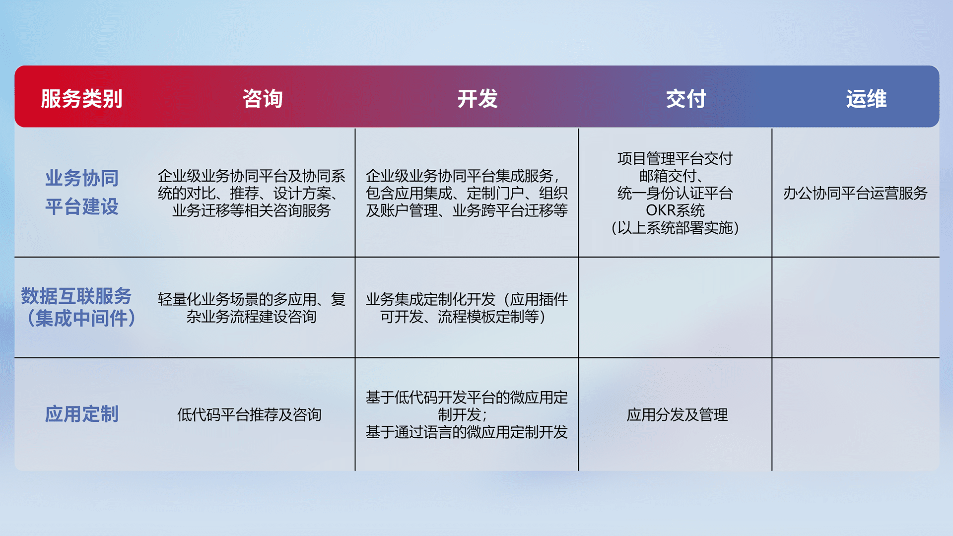 针对钉钉、、、企微、、、、IDaas等平台级产品提供产品的规划、、、方案、、、交付、、、、定制化开发等服务,,实现如统一协同办公、、智能客户服务、、混合会议管理、、智能数据查询、、、、等业务场景,,,,实现数字化转型。。。。